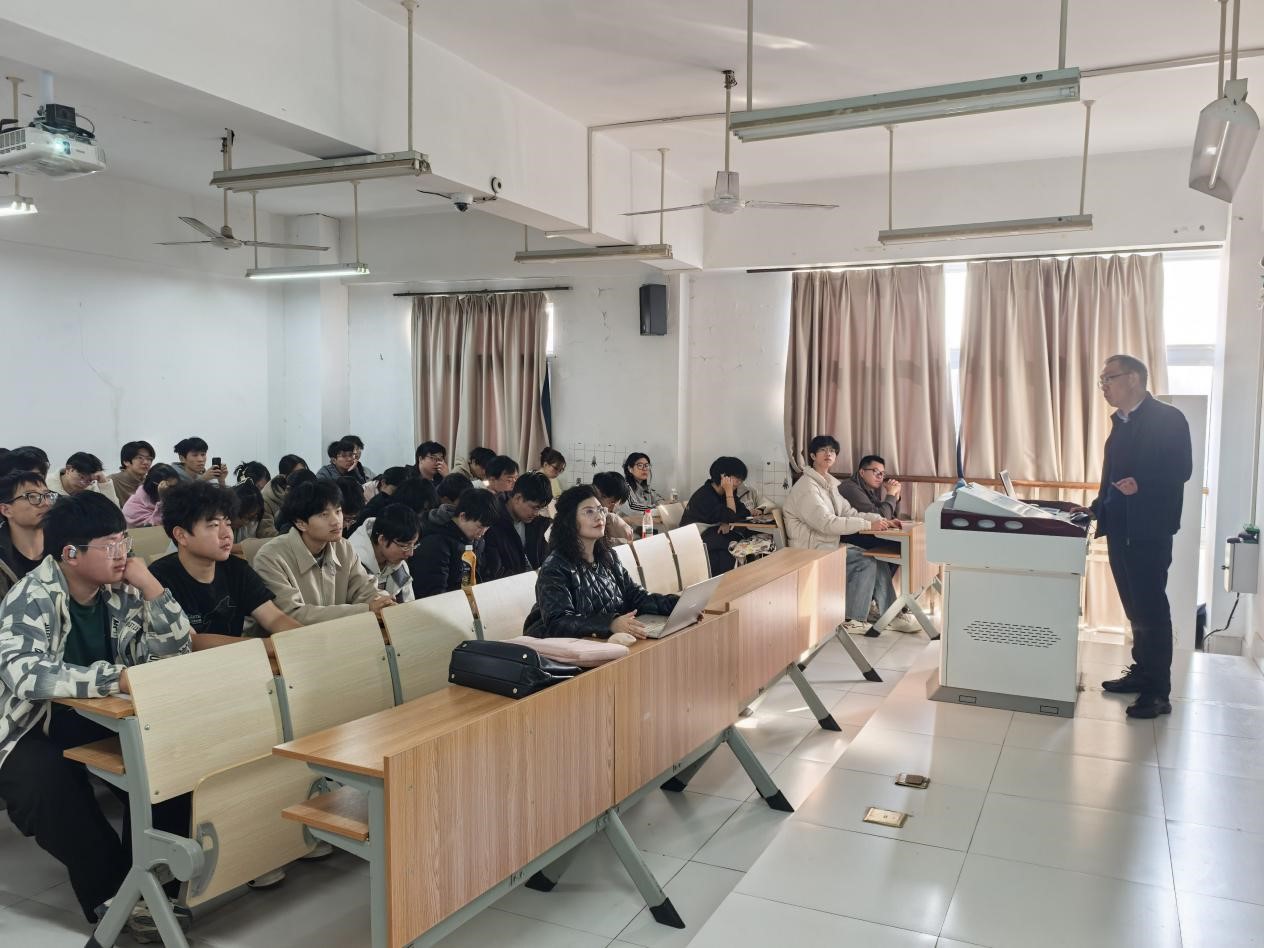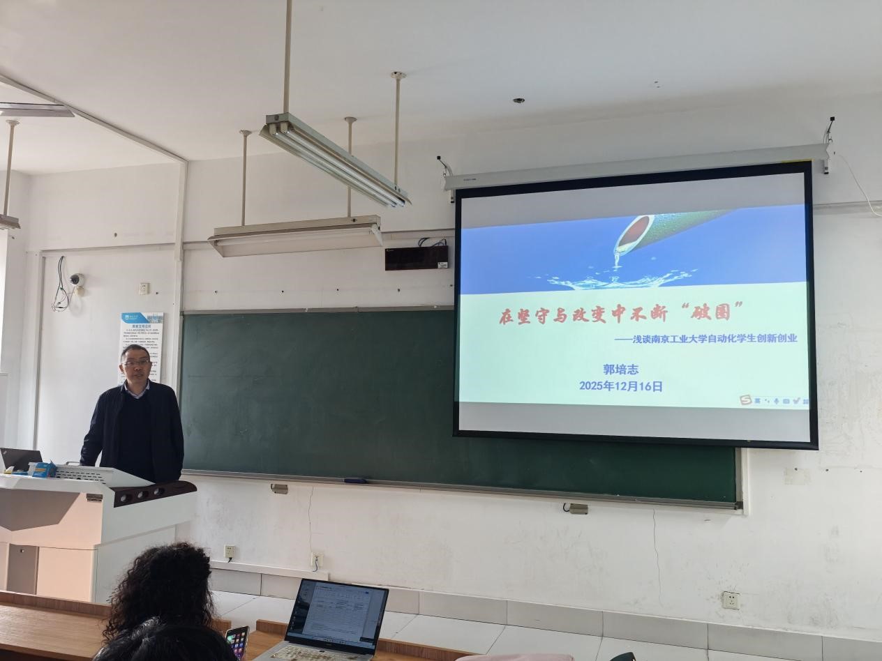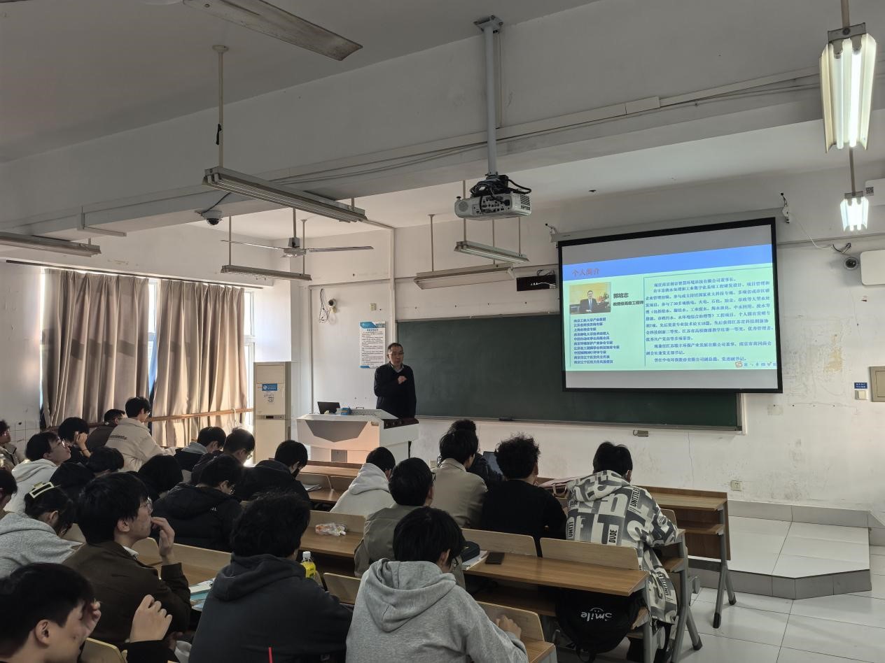近日,我院智能制造工程专业开展“产业教授进课堂”活动。南京创谷智慧环境科技有限公司董事长、南工大产业教授郭培志走进 2024 级智能制造工程专业课堂,以“在守望与改变中不断‘破圈’”为主题,为同学们带来一堂紧贴政策导向与产业实践的创新创业专题课。
